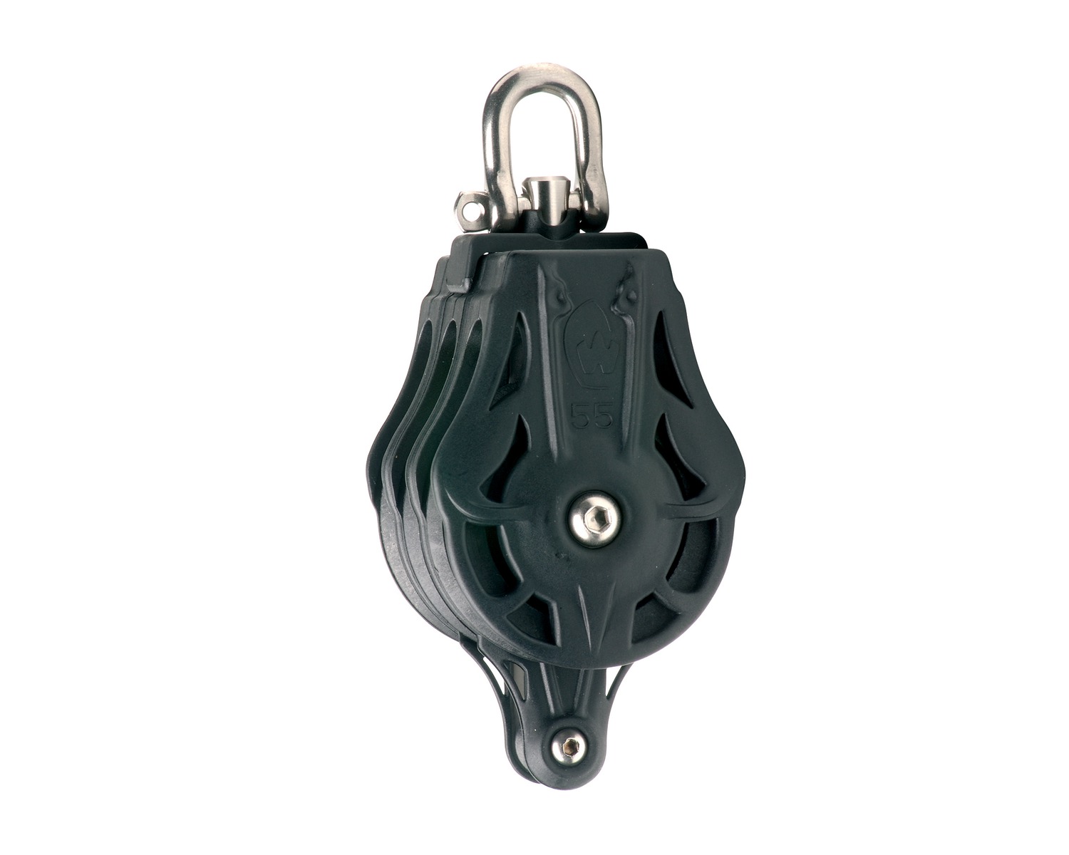 Rotation du réa sur l'axe inox. Protection du réa par les flasques. Réa démontable pour l'entretien. Large choix de fixations grâce à la tête universelle.
