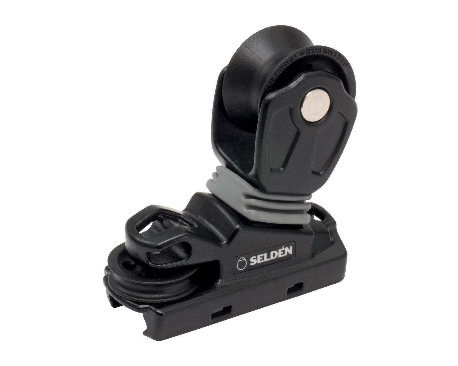 Chariot de génois sur patins 3 brins Selden pour Sytème 22, avec réglage par bosse. Le chariot d'écoute de génois est en aluminium laqué noir et glisse sur des patins intégrés.