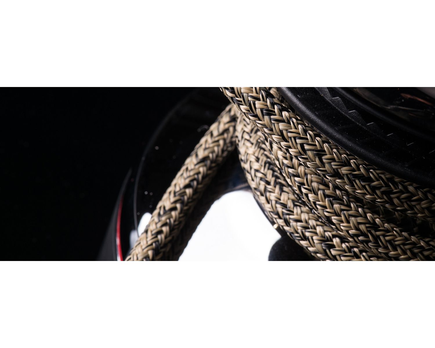 Gaine extérieure tressée, 24 fuseaux, en polyester. Ame tressée à pas longs en fibre HMPE (polyéthylène haut module).