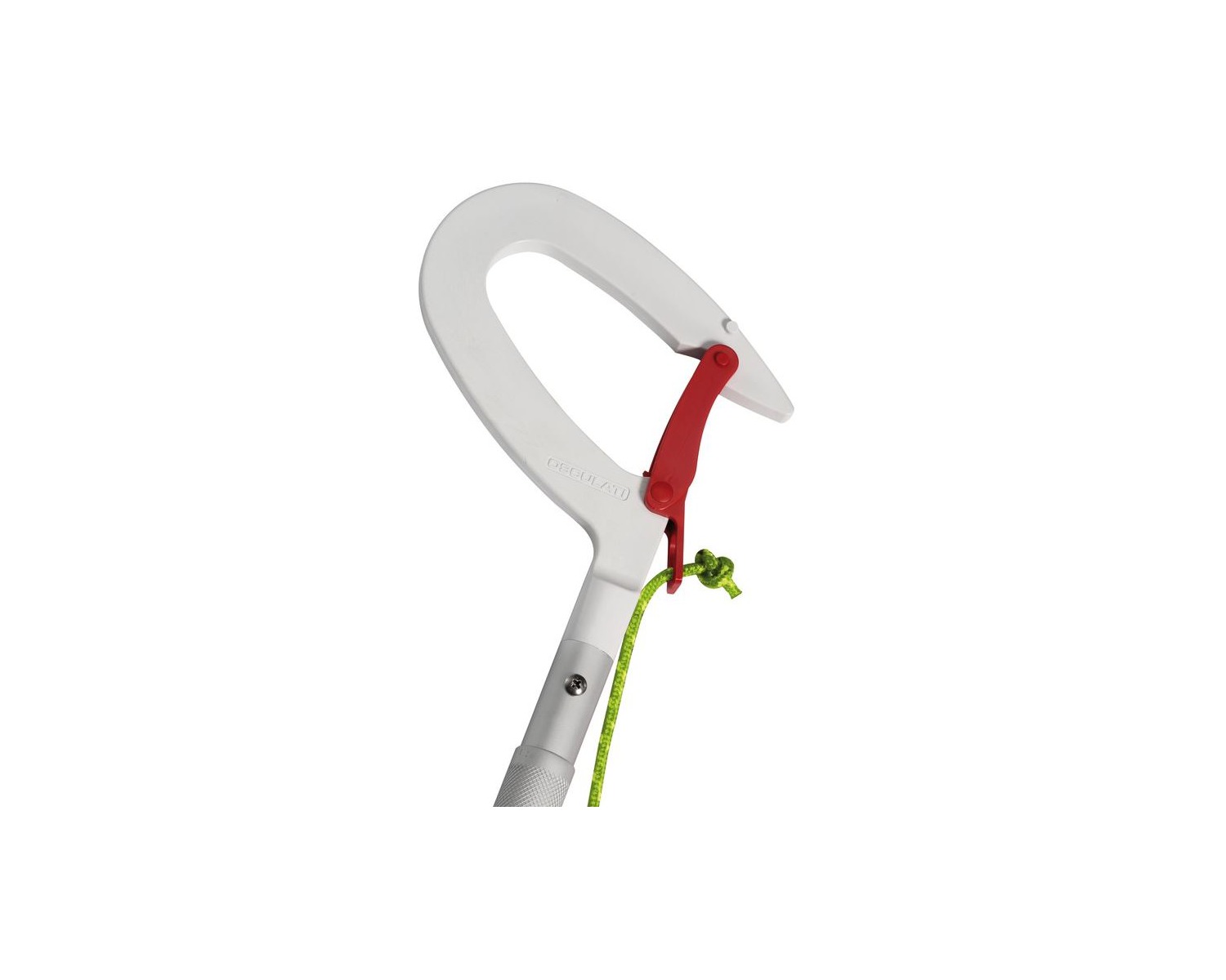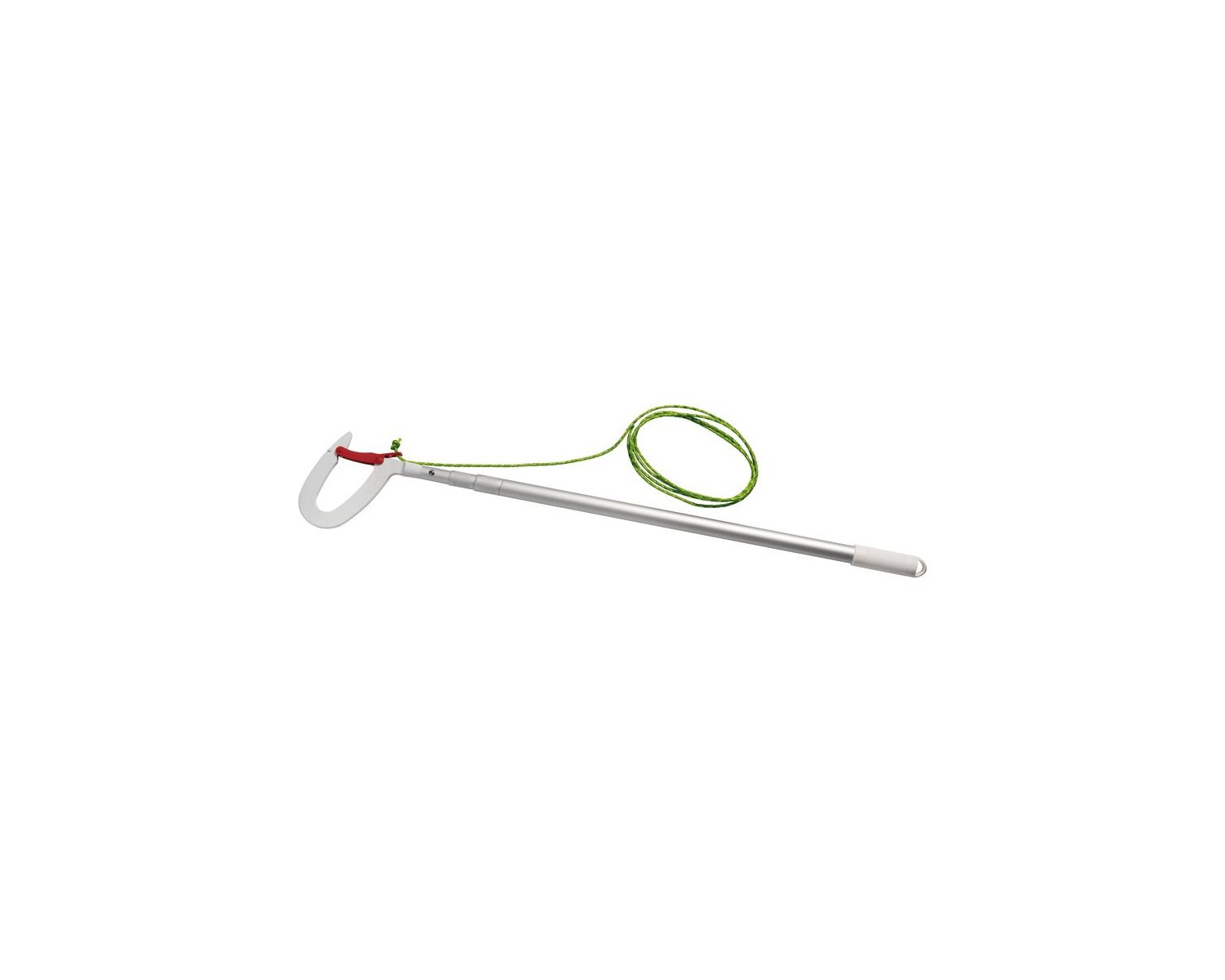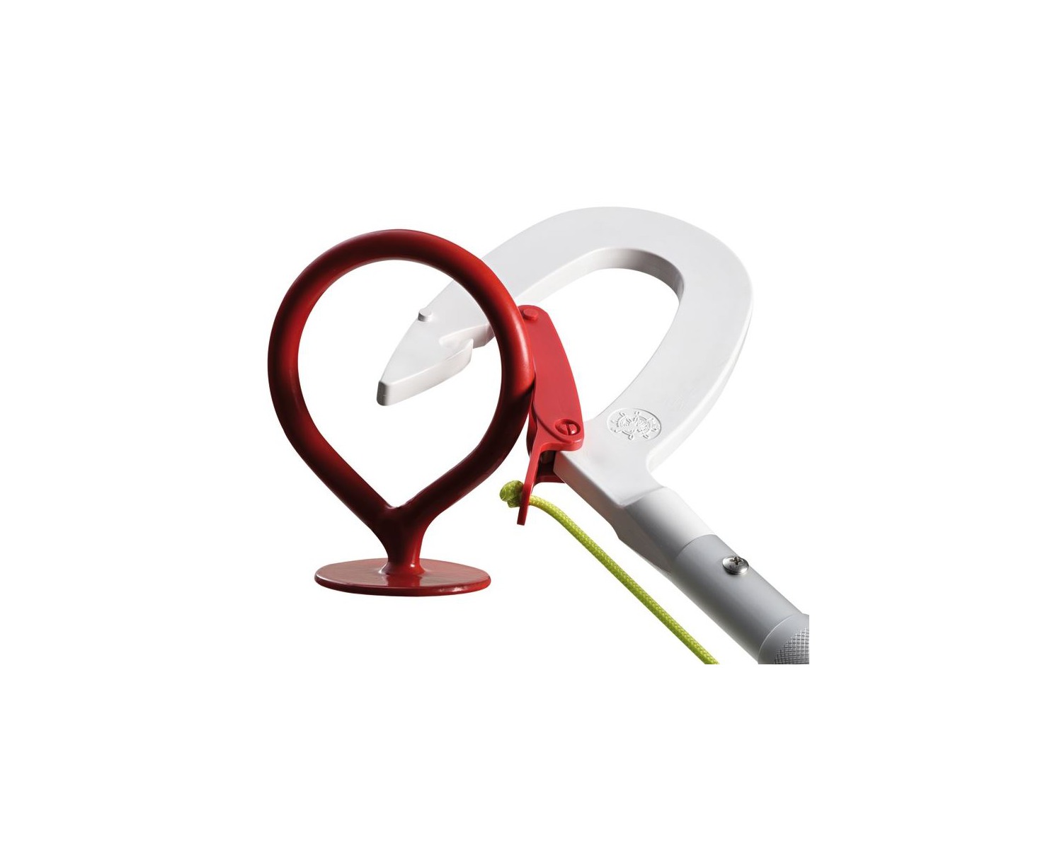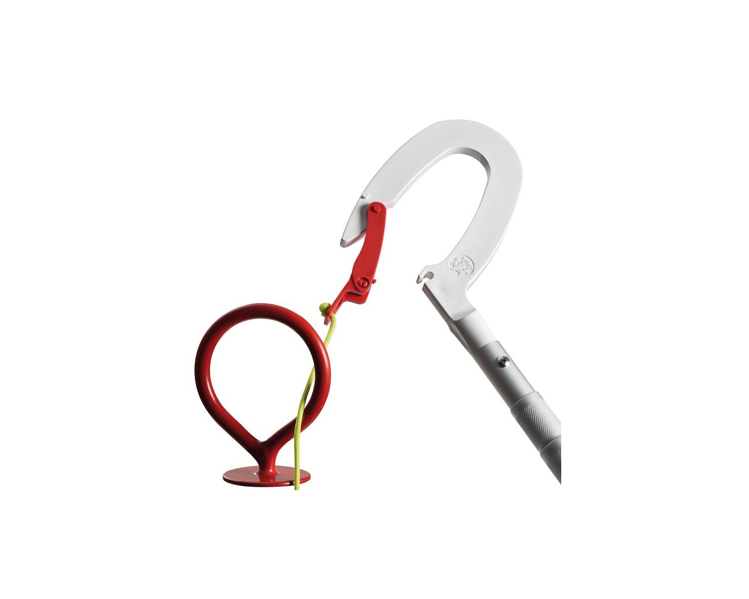 En plus de sa fonction de gaffe, le crochet permet d’effectuer en un seul mouvement l’accrochage de l’œillet et la récupération du bout d’amarrage.