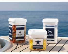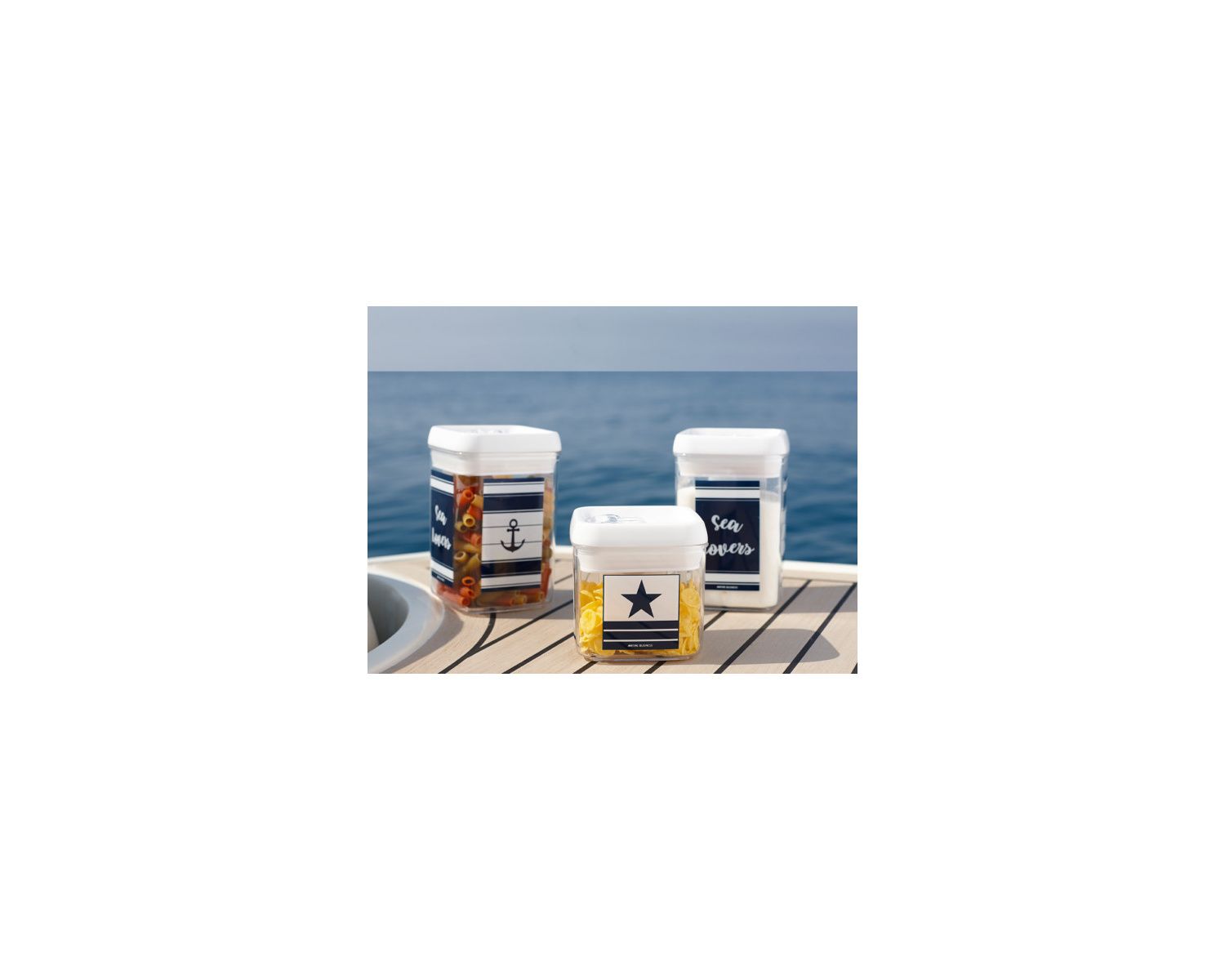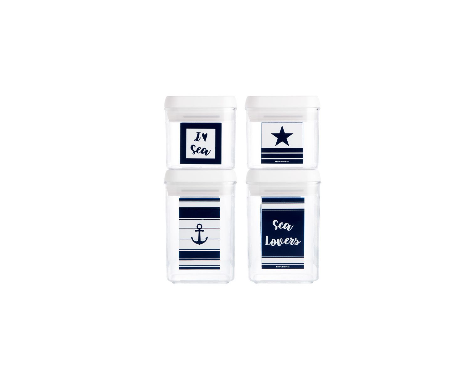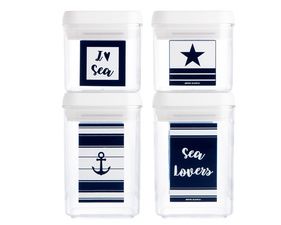 Set pratique de 4 pots de cuisine transparents avec design nautique.