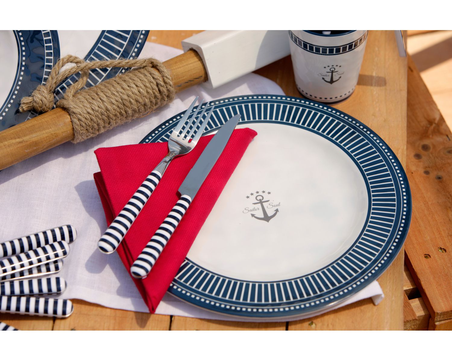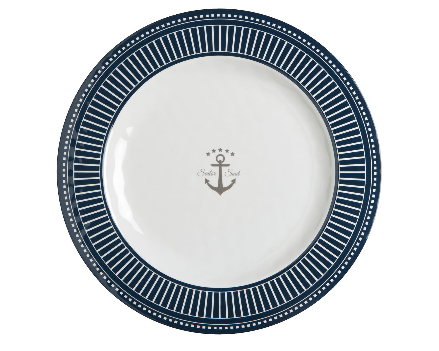 La grande assiette plate en mélamine fait partie de la vaisselle en mélamine incassable Sailor Soul qui dispose de sets d’assiettes, mugs, saladier, tout fabriqué en mélamine, décorée avec un style nautique très élegant.