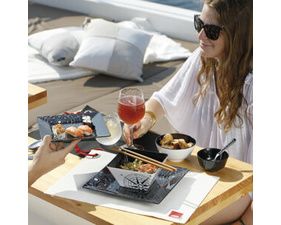 Assiette à dessert carrée en mélamine de la ligne LOMBOK, antidérapante. Conçue pour les marins modernes, et pour les nouvelles lignes de bateaux. Grâce à ses dimensions, l’assiette à dessert peut également être utilisée comme plat principal. Fabriquée en mélamine de haute qualité, certifiée et sans substances toxiques (BPA Free), l’assiette à dessert Lombok est en mélamine noire et possède un anneau antidérapant à la base.