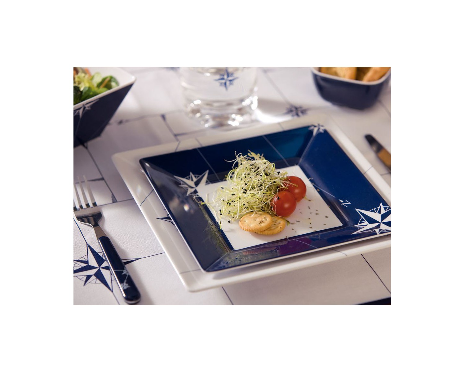 Cette collection comprend des assiettes rondes et carrées : choisissez votre style! Toutes les assiettes de cette vaisselle incassable sont en mélamine agrémentée du motif de la rose des vents, comme les autres accessoires de la collection bicolore marine et blanc.