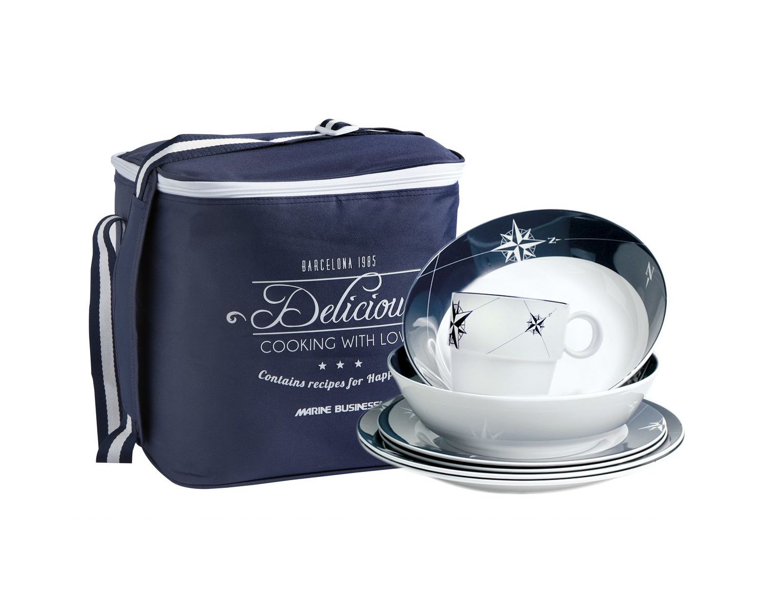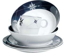Vaisselle NORTH WIND lot de 24 pièces en mélamine : 6 Mugs, 6 Assiettes plates, 6 Assiettes creuses, 6 Assiettes à dessert. Une large gamme de vaisselle et d'accessoires pour la table "spécial bateau"