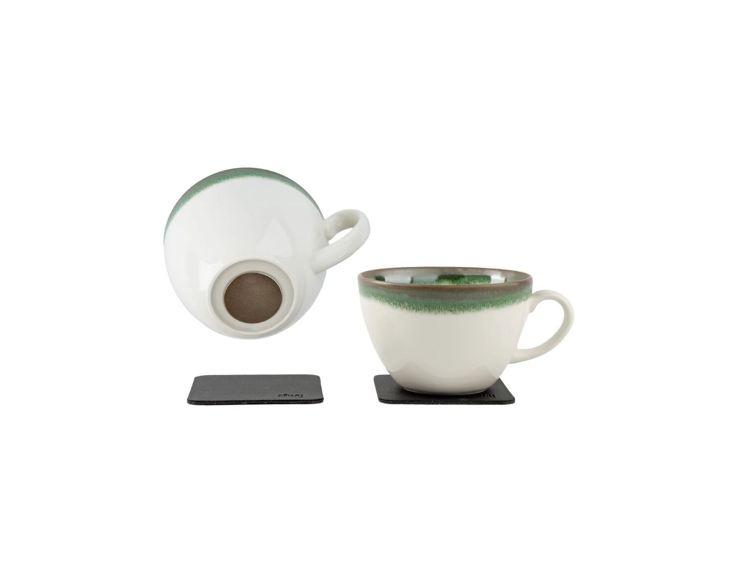 Un aimant élégamment moulé à la main est intégré au fond des tasses en porcelaine. Pour que les coupelles restent en place pendant la conduite, elles doivent être associées à une contrepartie métallique . L'ensemble comprend deux tampons nano-gel métalliques. Le rapport de force entre les coupelles magnétiques et les coussinets métalliques nano-gel est parfaitement équilibré, de sorte que les coupelles peuvent être fixées par les coussinets d'une part, mais peuvent également être facilement retirées des coussinets pour boire. Grâce à la technologie intelligente nano-gel, les coussinets peuvent être retirés à tout moment sans laisser de résidus , nettoyés à l'eau claire et réutilisés aussi souvent que souhaité . Cela vous offre une flexibilité maximale et vous pouvez toujours utiliser vos gobelets magnétiques partout où vous en avez besoin ou les ranger en toute sécurité dans le placard sans bruit.