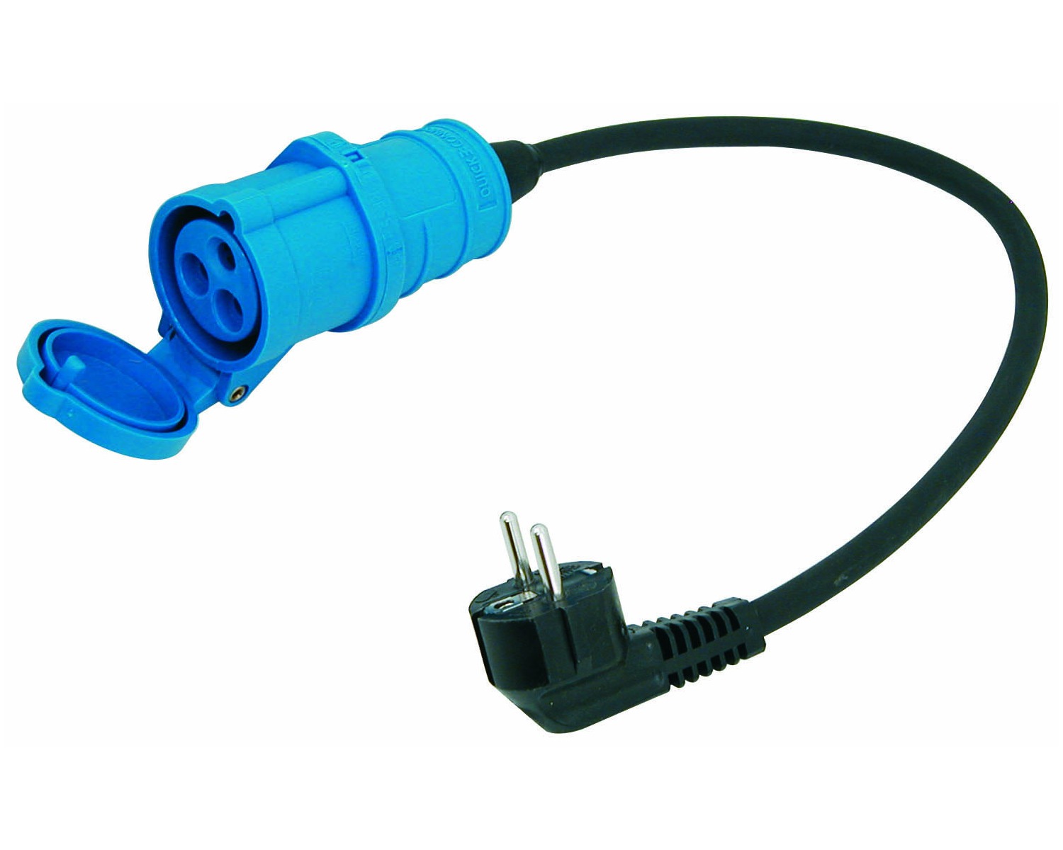 Adaptateur : Fiche femelle (prolongateur) P17 à clapet bleu IP44 + câble 3x1.5mm² + fiche mâle 16A caoutchouc.
