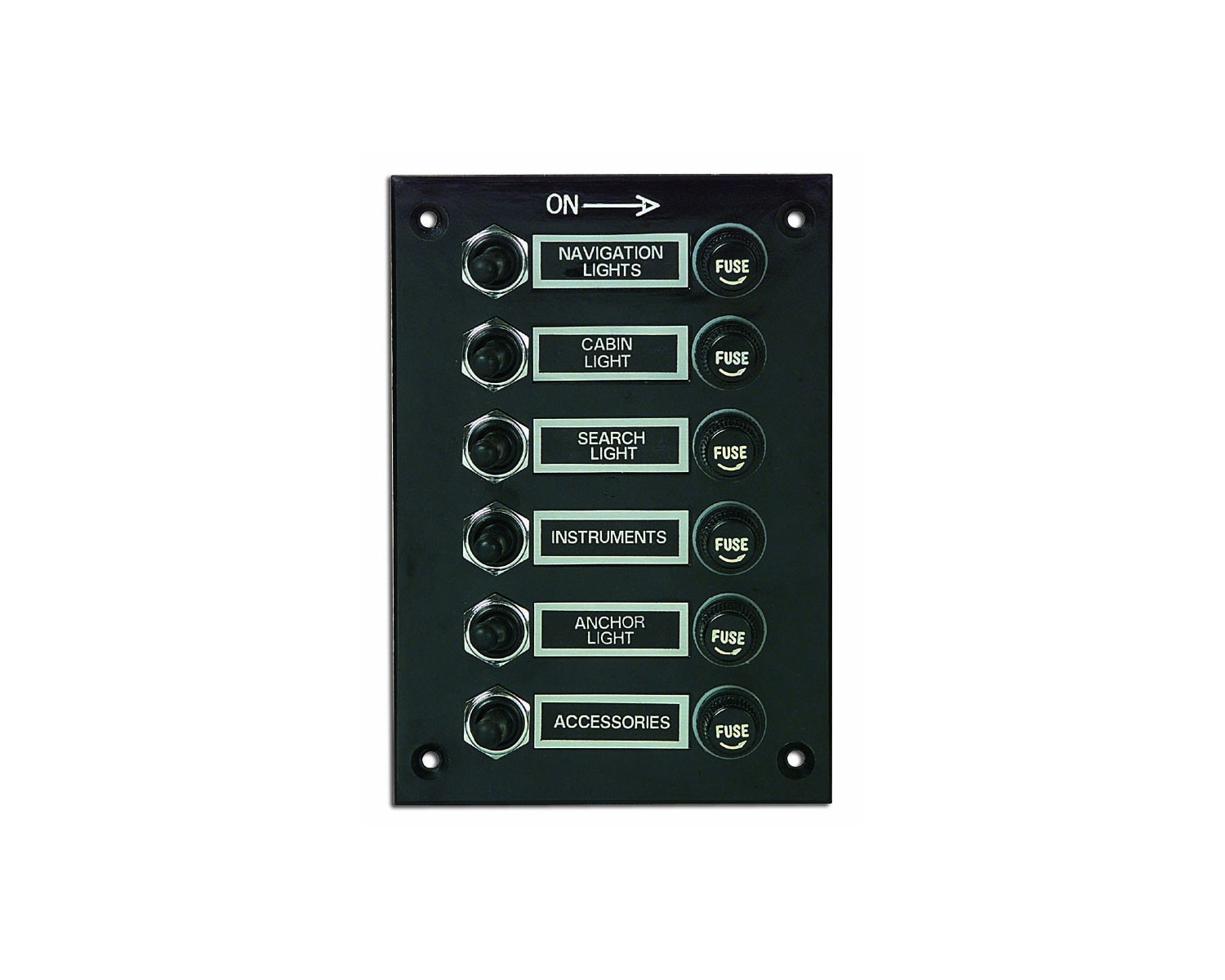 Tableau électrique étanche 6 interrupteurs. En bakélite noire avec interrupteurs en laiton. Porte fusible et 10 étiquettes en Anglais.