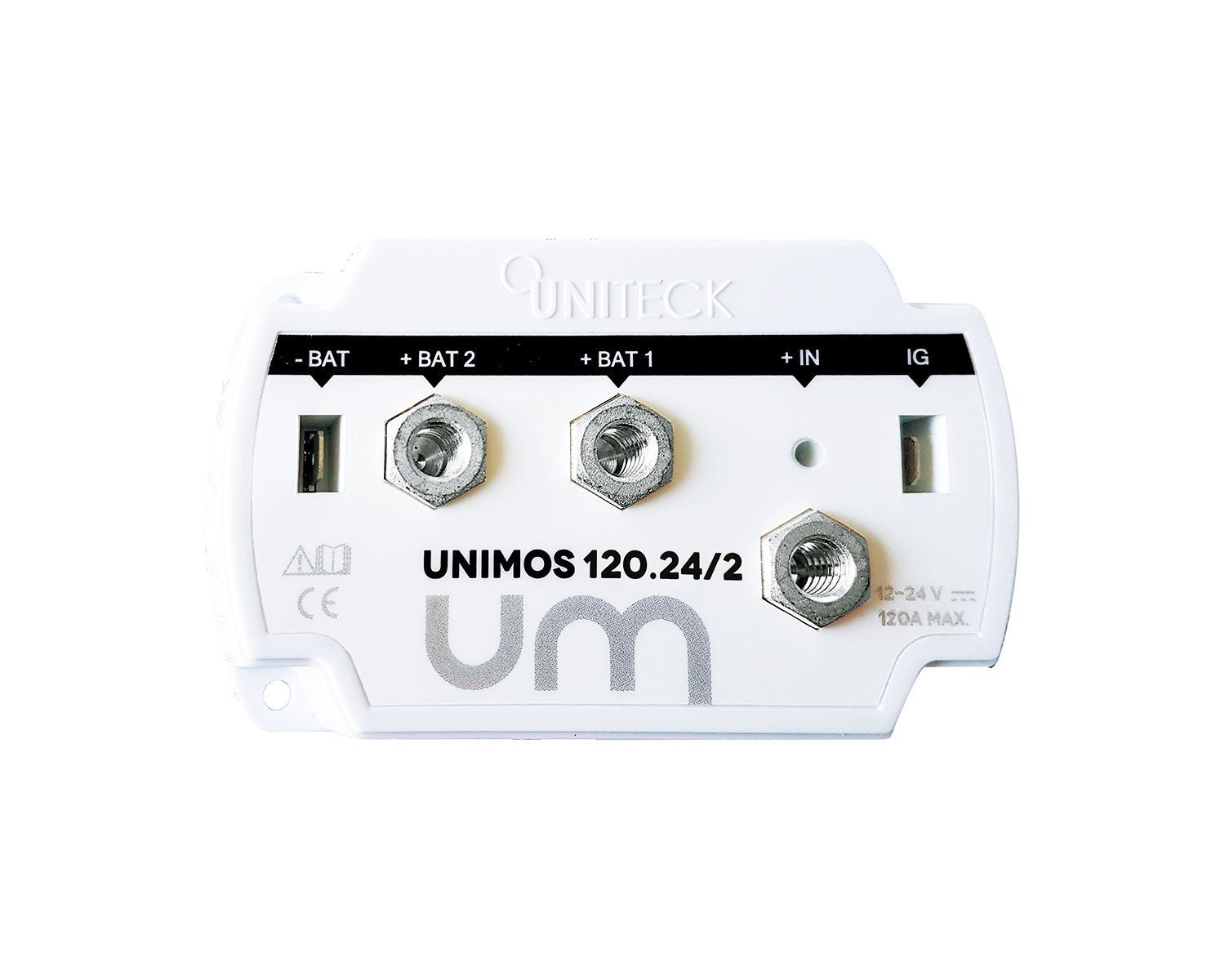 UNIMOS répartit la charge de votre alternateur, régulateur de charge solaire ou chargeur de batterie automatique sur chacune de vos batteries sans perte de puissance tout en isolant chaque batterie pour éviter qu'elles se chargent et se déchargent entre-elles.