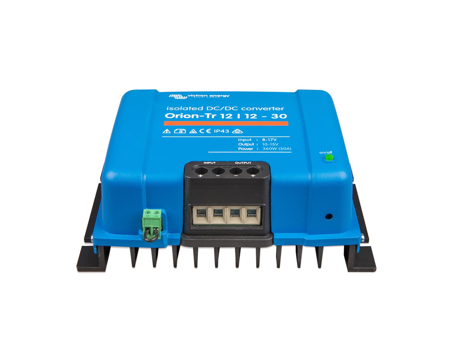 Le convertisseur Orion DC/DC 12/12 V Victron permet de réguler une source instable de 8 à 17 V en 12 V, ceci afin de protéger certains appareillages sensibles.