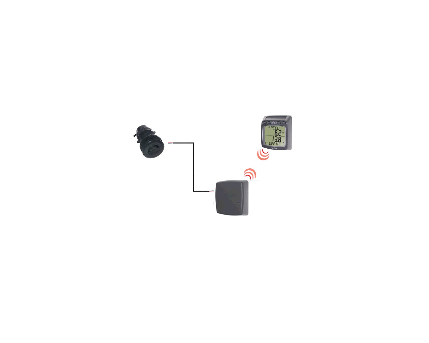Pack composé sonde vitesse-profondeur-température combinée, d’un émetteur de coque et d’un afficheur double numérique.