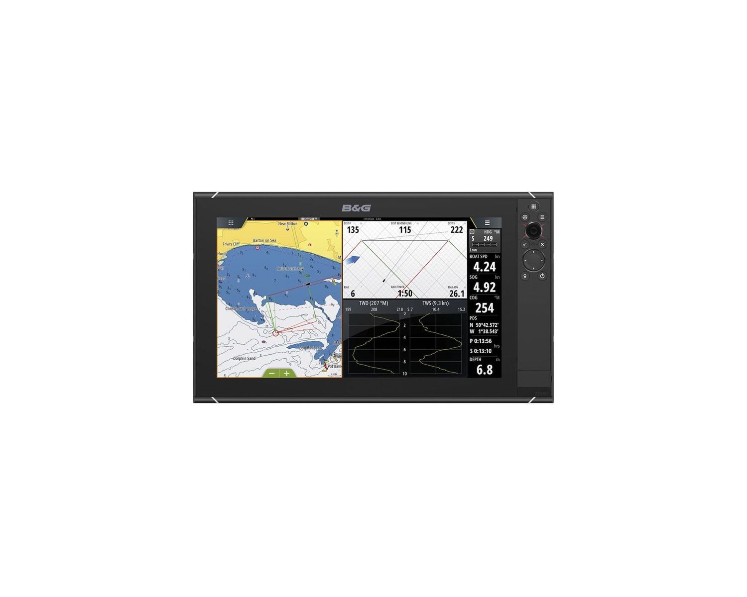 Avec Zeus³, profitez d'un contrôle total dans toutes les conditions. Parfait pour la plaisance ou la compétition, le Zeus³ est doté d'un superbe écran tactile et d'un clavier, d'un processeur ultrarapide et des fonctionnalités primées de navigation à la voile de B&G. Laissez Zeus³ vous guider jusqu'à votre destination.