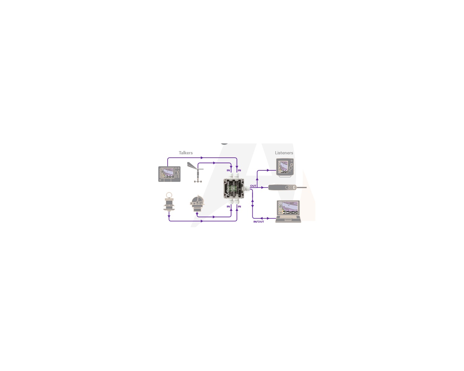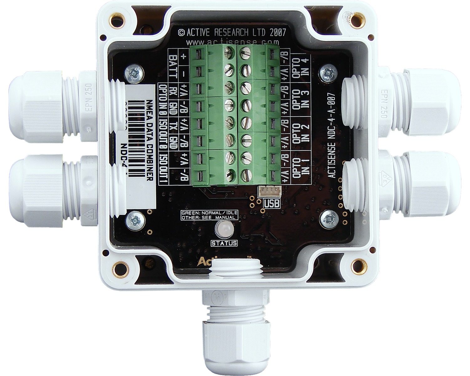 Deux sorties ISO-Drive vous permettent en plus de créer deux débits émetteurs en réception. Le multiplexeur NMEA Actisense NDC-4 fournit un accès à toutes les sources de données NMEA 0183, et permet au PC connecté par USB de lire et d’ajouter des flux de données combinées.