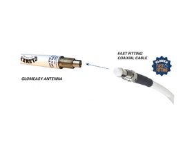 Sur l’extrémité inférieur, l’antenne dispose d’une virole filetée 5/8”x24 à laquelle on peut brancher des équerres et supports pour une installation extrêmement facile et rapide et le nouveau câble coaxial RG62 de Glomex, de haute quAlité, à faible perte et de différentes longueurs avec un connecteur spécial FME, professionnel et miniaturisé déjà inséré dans les deux extrémités.