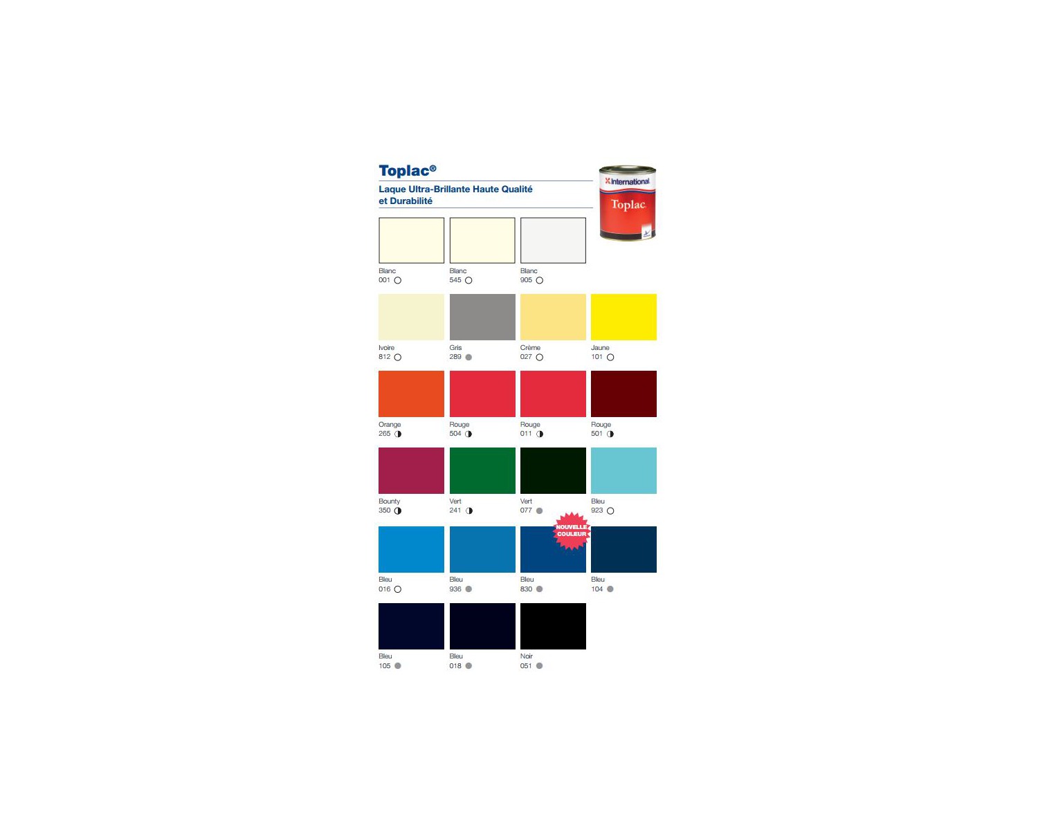 Avec sa formulation ultra résistante (2 fois mieux qu’une laque traditionnelle), son maintien face aux UV, la tenue de ses couleurs, sa facilité d’application, son excellent tendu, etc… c’est sans surprise que Toplac reste indétrônable. N°1 des ventes, c’est la laque pour bateau de premier choix pour ceux qui tiennent à une finition soigné et robuste.