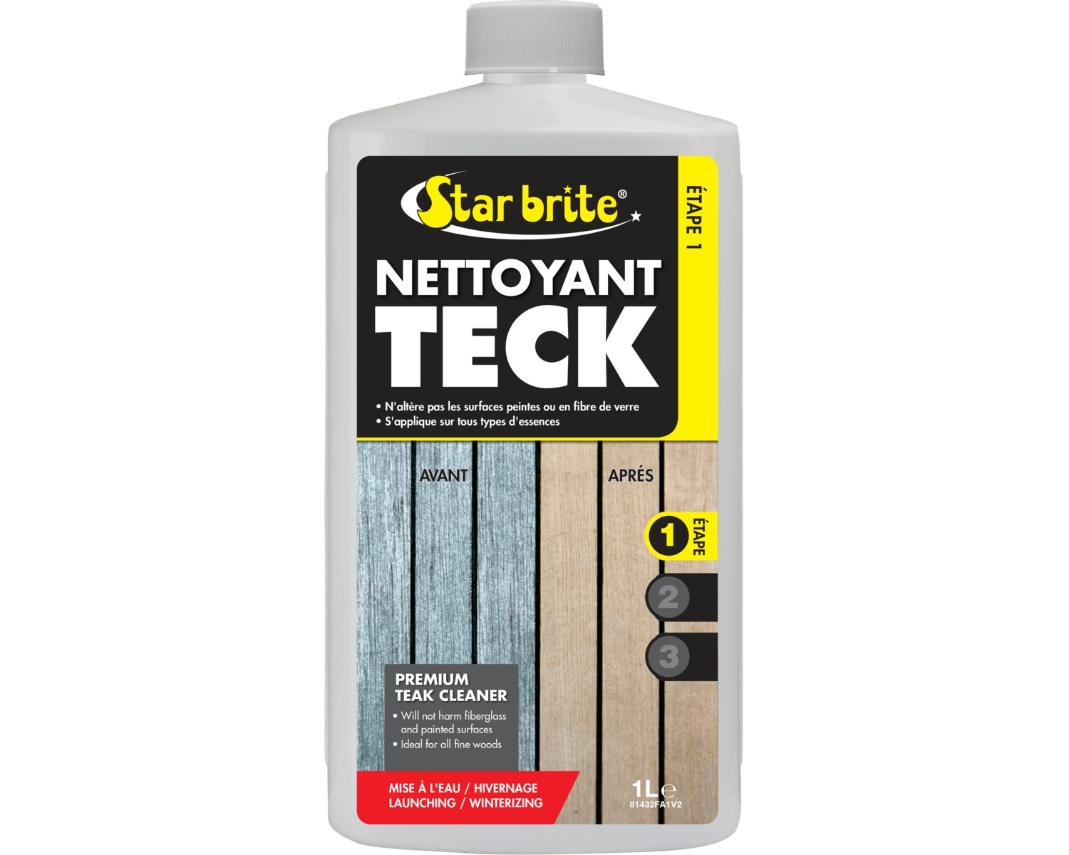 Pour les bois très sales et très grisés, appliquer directement le Nettoyant Teck sur la surface sèche. Etaler le produit à l'aide d'une brosse dure ou d'un abrasif medium. Laisser agir Star brite Premium Nettoyant Teck 2-3 minutes, puis frotter dans le sens des fibres du bois pour assurer un nettoyage en profondeur. Rincer abondamment à l'eau douce. Pour les endroits tachés, utiliser une paille de fer inox pour enlever les taches, même les plus tenaces. Pour un Teck peu sale: Mouiller le bois à l'eau douce. Etaler Stra brite Nettoyant Teck Premium et frotter légèrement à l'aide d'une brosse dure ou d'un abrasif medium. Rincer abondamment à l'eau douce. Après le Nettoyage, utiliser Star brite PremiumRénovateur Teck pour redonner au bois sa couleur naturelle et ouvrir les veines du bois pour une meilleure pénétration de l'huile. Enfin, appliquer Star brite Premium Golden Teak Oil ou le Protecteur Teck Sealer pour la protection. NOTE: En cas de projection de produit sur des surfaces à ne pas traiter, rincer immédiatement à grande eau. Eviter tout contact avec des tissus.