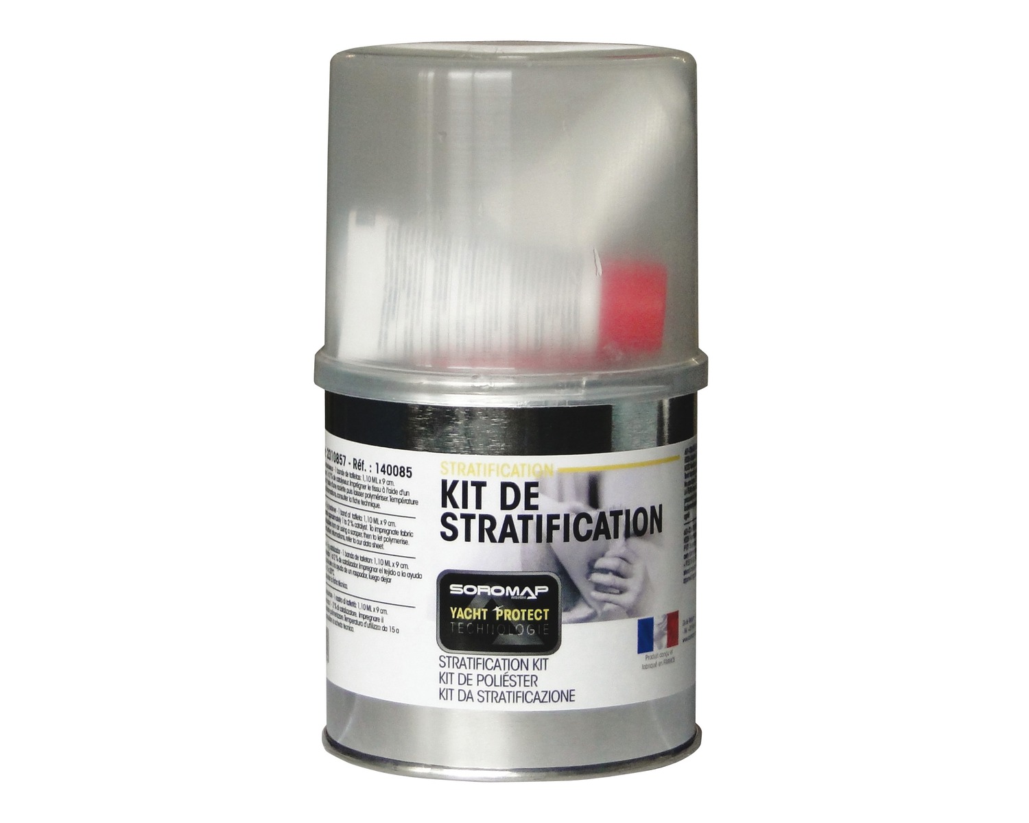 Le kit de stratification contient : 250 g de résine polyester, 5 g de catalyseur et 1 bande de taffetas 1.10 m x 9 cm.