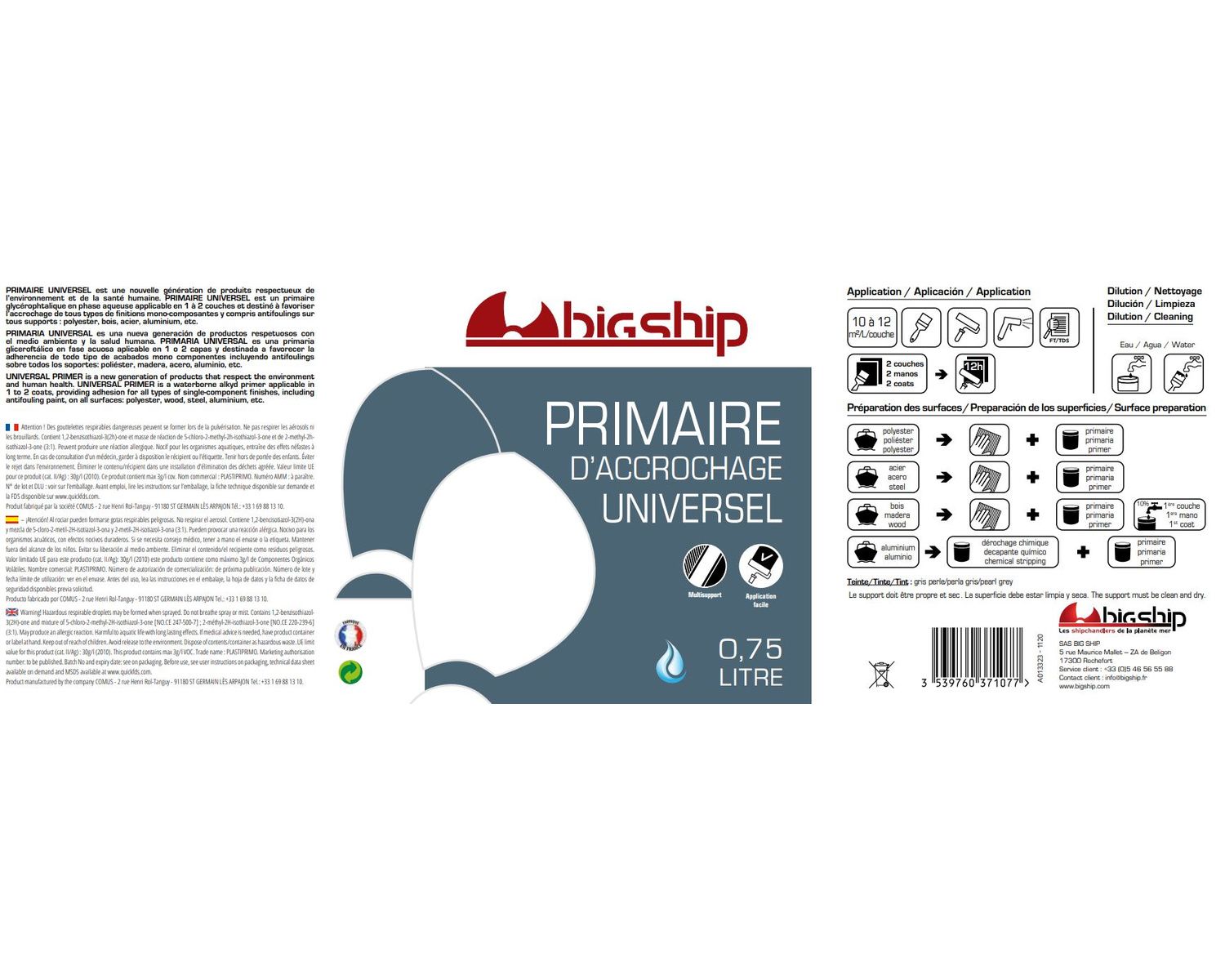 PRIMAIRE UNIVERSEL est un primaire glycérophtalique en phase aqueuse applicable en 1 à 2 couches et destiné à favoriser l’accrochage de tous types de finitions mono-composantes y compris antifoulings sur tous supports : polyester, bois, acier, aluminium, etc.