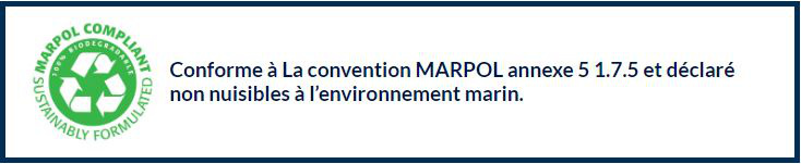 • Conforme à La convention MARPOL annexe 5 1.7.5 et déclaré non nuisibles à l’environnement marin.