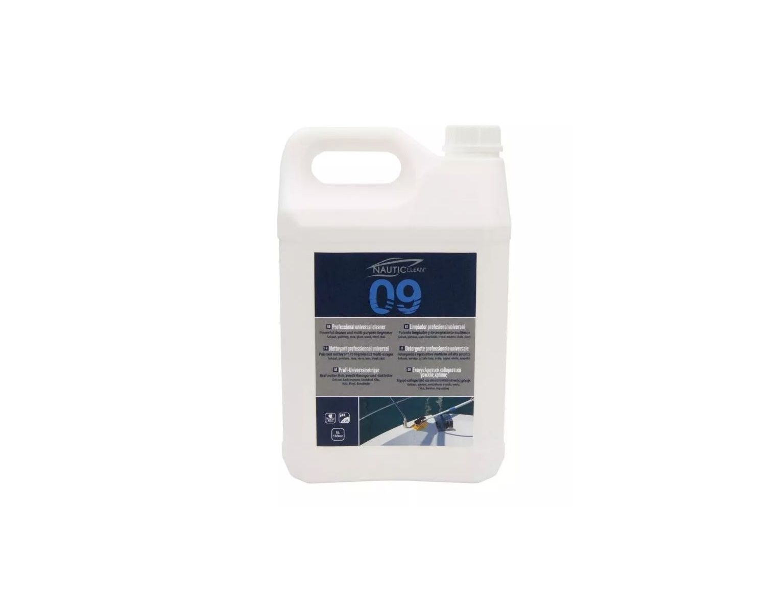 Détergent alcalin spécialement formulé pour bateaux, contenant des complexants et séquestrants spécifiques pour solubiliser parfaitement les traces de sodium, de calcium, la graisse, les dépôts de fumée, les poussières atmosphériques.