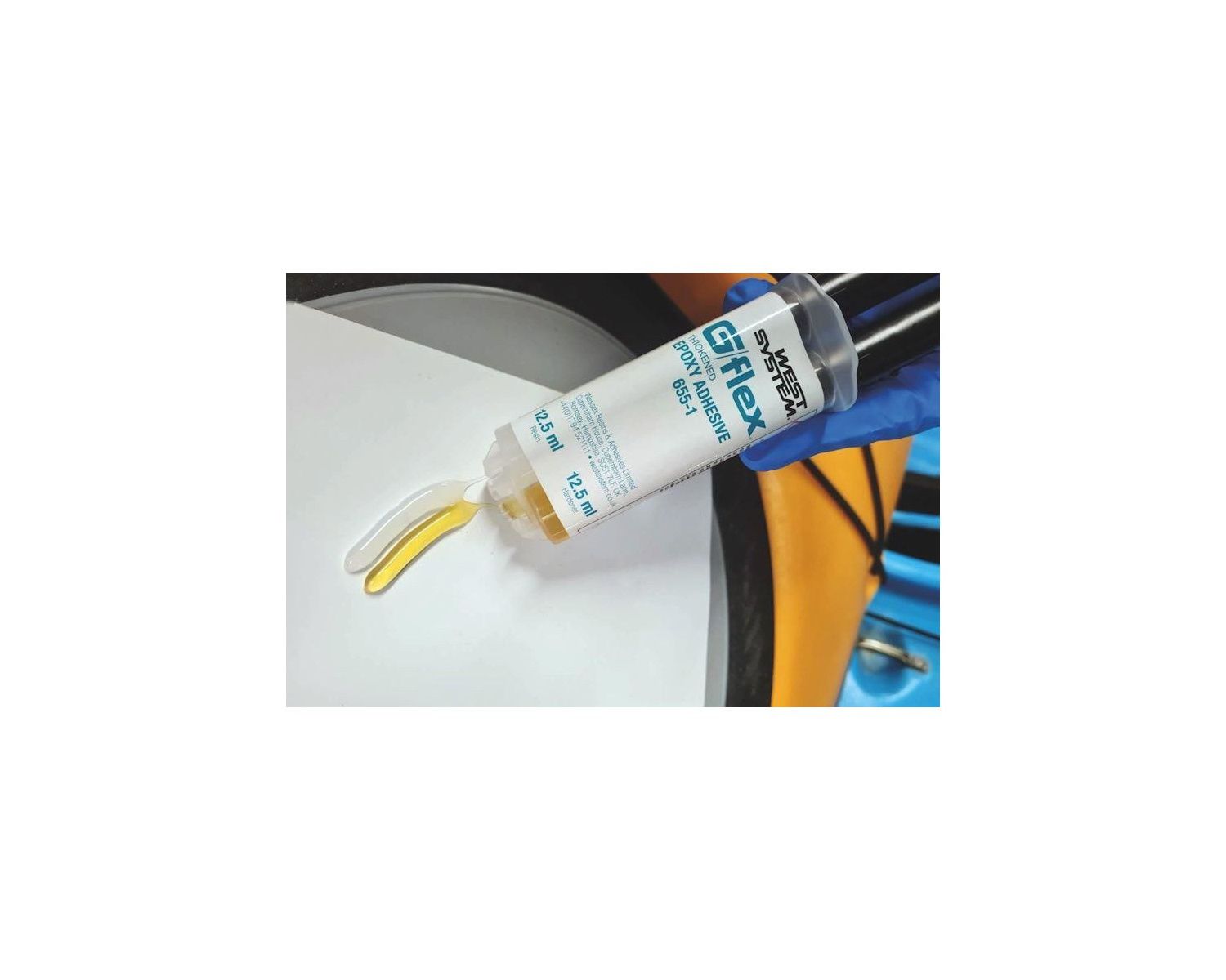 G/flex 655 est une résine époxy renforcée qui permet de réaliser des liaisons structurelles permanentes et étanches. Il absorbe les contraintes d'expansion, de contraction, de choc et de vibration. G/flex adhère avec ténacité aux plastiques HDPE, LDPE ABS, PVC, Polycarbonate et Hypalon. Il colle également le métal, le verre, la maçonnerie, la fibre de verre et le bois. La seringue de G/flex 655-1 contient 0,42 oz de résine et 0,42 oz de durcisseur, ce qui est parfait pour les petits travaux de réparation.