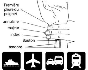 Mode d'emploi : Portez un bracelet Sea-Band à chaque poignet. La boule blanche doit presser contre la peau, sur le Point Nei Kuan de chaque poignet, comme indiqué sur l’illustration.Pour trouver le Point Nei Kuan, tournez la paume de la main vers le haut, placez les trois doigts de l’autre main (index, majeur, annulaire) sur l’avant-bras, l’annulaire contre la première pliure du poignet. Le Point Nei Kuan se trouve sous le rebord de l’index, entre les deux tendons fléchisseurs de la main.