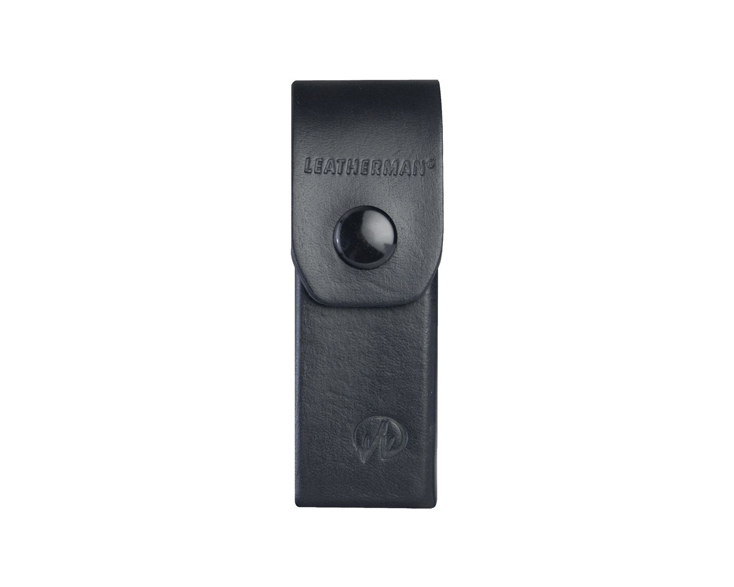 Etui en cuir avec logo et inscription Leatherman. Fermeture à bouton-pression pour l’accrocher à la ceinture.