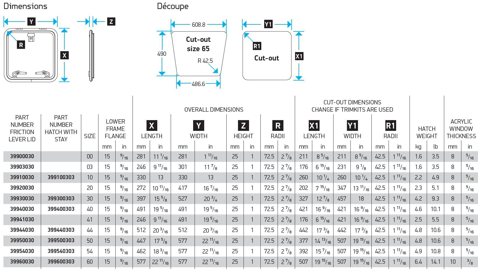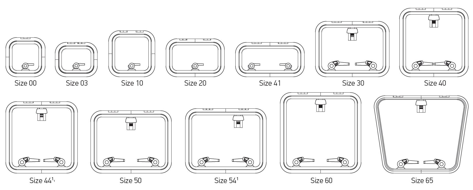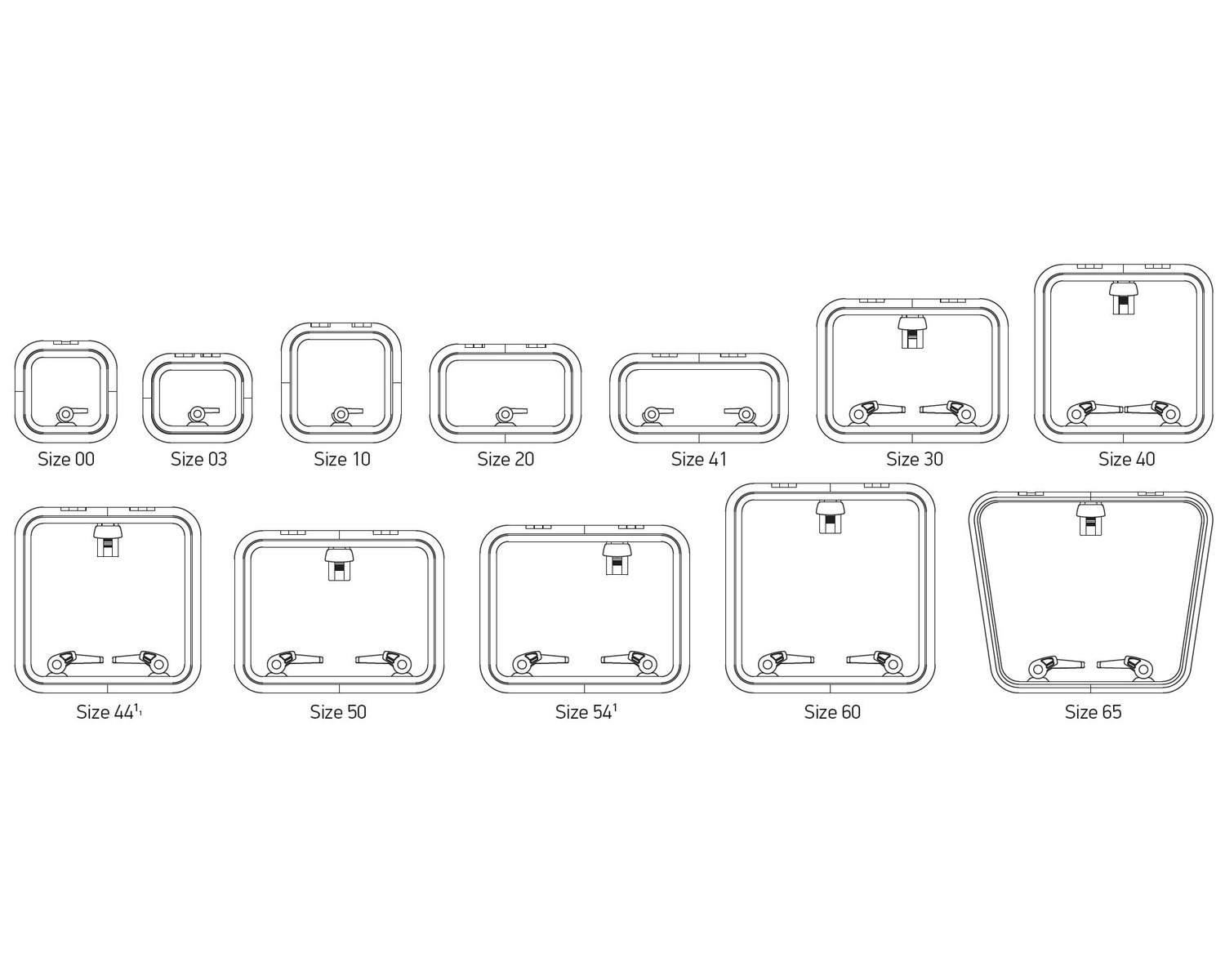 Ils sont équipés d'un bras de maintien en position ouverte, de poignées extérieur permettant d'ouvrir le panneau depuis le pont s'il n'est pas verrouillé de l'intérieur, d'un cadre en aluminium anodisé pour une meilleure résistance à la corrosion.