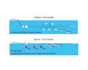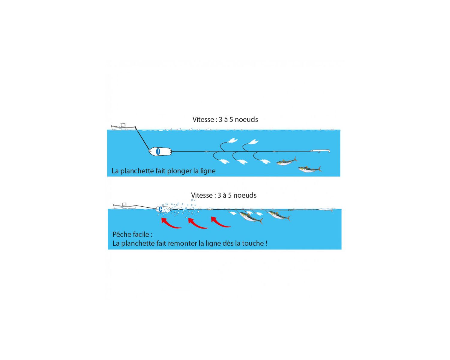 Utilisation: Ne pas plomber, la planchette "DELTA" descend avec la vitesse du voilier et remonte à la surface dès la touche. Elle remonte également, en cas d'accrochage d'algues et dès que la ligne prend du mou lors des virements de bords.