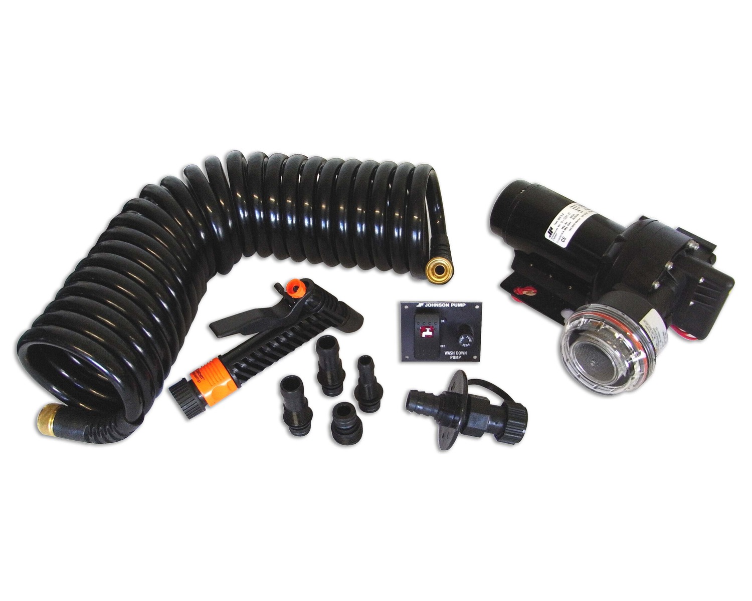 Kit complet de lavage comprend une pompe haute capacité Aqua Jet WD 5.0 , un pré-filtre , un bec pulvérisateur, un support de cloison avec clapet anti-retour 7,50 m de tuyau de lavage en serpentin et interrupteur éclairé.