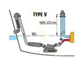 Si le point d’injection de l’eau de refroidissement dans l’échappement est situé à moins de 15 cm au-dessus de la flottaison, il peut se produire, lorsqu’on arrête le moteur, un flux d’eau qui entre dans le moteur, par effet de siphon. On peut éviter ce phénomène en positionnant sur la tuyauterie de refroidissement un coude anti-siphon VETUS, á 40 cm minimum au-dessus de la flottaison.