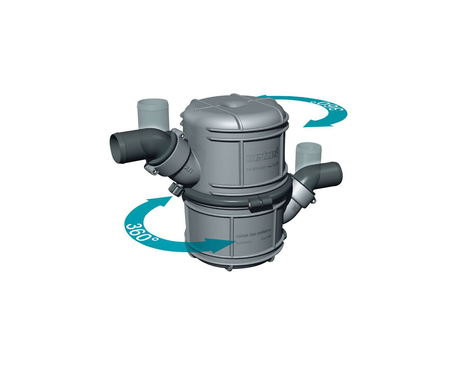 Les waterlocks NLP possèdent deux chambres, séparées par une plaque horizontale avec un tuyau ascendant au milieu. Comparés aux waterlocks mono-chambre, ces waterlocks NLP apportent une diminution du bruit beaucoup plus efficace. Comme la chambre supérieure peut pivoter à 360° environ et, que les raccords d'entrée et de sortie sont tous les deux orientables à 360°, l'installation du système d'échappement dans la chambre moteur, (toujours trop étroite!), est devenue beaucoup plus simple.