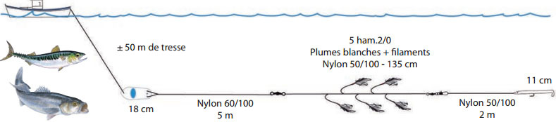 Raccorder le plomb à l'émerillon paternoster par un nylon (cassant) de 40/100 et 1m de long. Cette longeur est nécessaire pour faire travailler la ligne au-dessus du fond, sans accrocher. Un plomb de 300 à 500g est, en règle générale, suffisant pour une pêche à fond ou entre deux eaux.