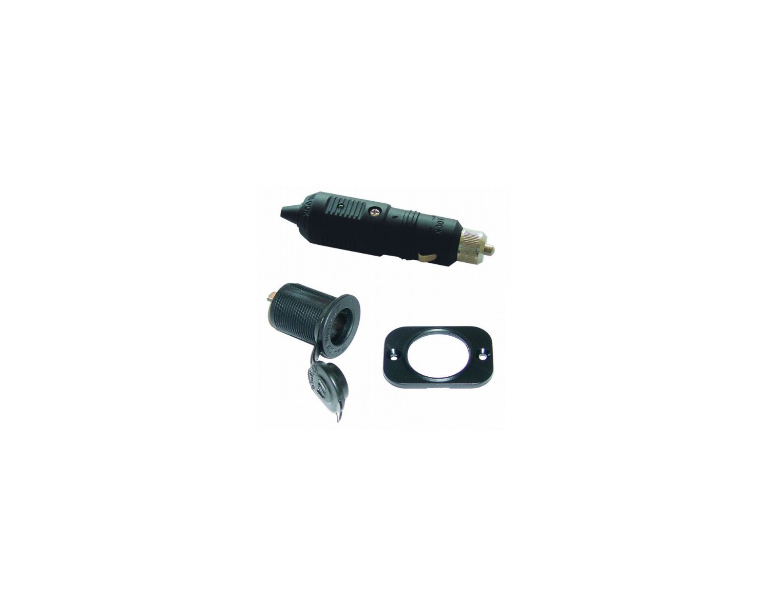 Kit fiche et prise de pont allume-cigare entièrement étanche, aussi bien lorsque le capuchon de protection est refermé que lorsque la fiche est branchée, car elle est équipée d'un collier étanche spécial et d'un système « lock-in » qui permet de bloquer la fiche en la faisant pivoter.