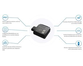 Equipé d'antennes GNSS internes, LTE, d'entrées numériques/analogiques/négatives et impulsionnelles configurables, de trois sorties DOUT, d'une connectivité Bluetooth et d'une batterie de secours.
