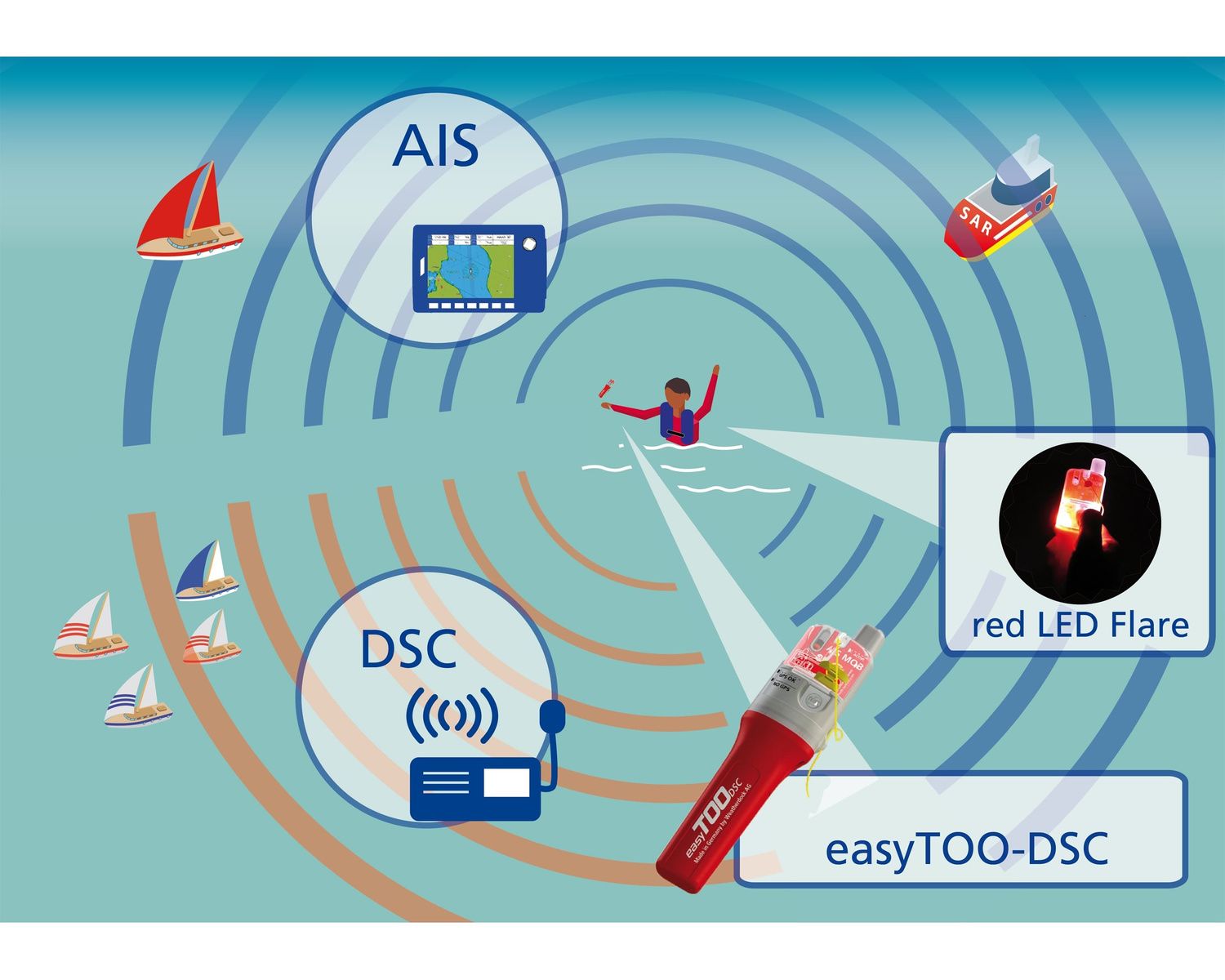En plus de l'ASN, l'émetteur d'urgence transmet aussi un signal de détresse AIS. Le signal est réceptionné par tous les navires équipés de récepteur AIS, dans un rayon pouvant aller jusqu'à 7 milles. Les données sont mises à jour et retransmises toutes les minutes.