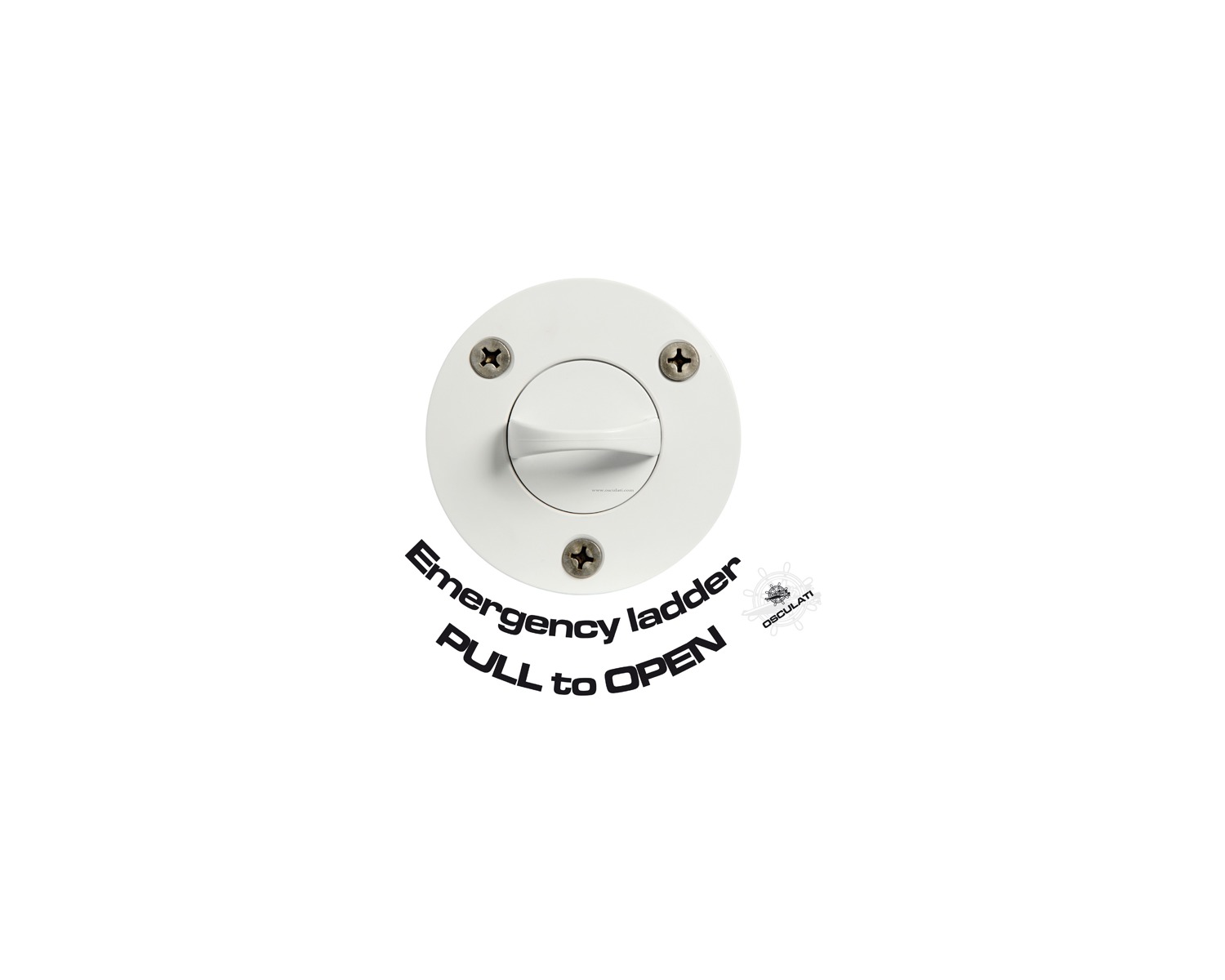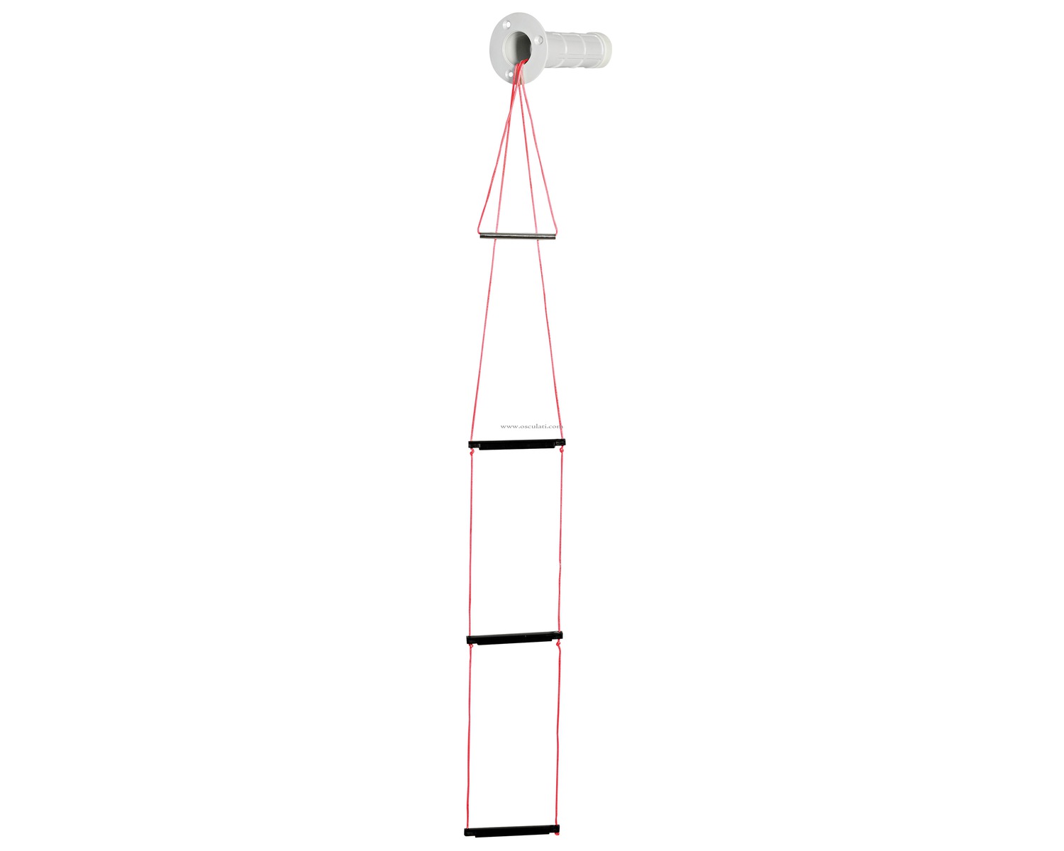 Compartiment étanche en thermo-polymère. Echelle avec montants en tresse nylon et marches en thermo-polymère haute résistance. Installation sur la ligne de flottaison. Très facile à utiliser: la personne à la mer tire l'anneau du bouchon de fermeture et cette operation permet de sortir l'échelle de son compartiment.