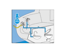 Le boîtier entrée d'eau permet de connecter l'installation en eau du bord à l'alimentation en eau du ponton. Ainsi, vous pouvez prendre une douche ou faire la cuisine au ponton, sans utiliser l'eau des réservoirs. (Ne doit pas servir au remplissage des réservoirs).