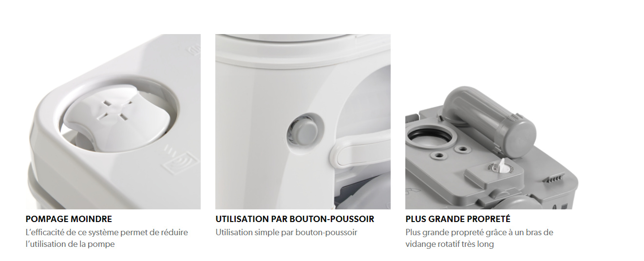 Toilettes légères et portables, parfaites pour les bateaux grâce à sa conception compacte unique. La technologie du bouton-poussoir facilite leur utilisation et assurent un rinçage puissant et hygiénique, un pompage moindre et une meilleure propreté. Les toilettes sont dotées d’une capacité du réservoir à matières de 9,8 l.